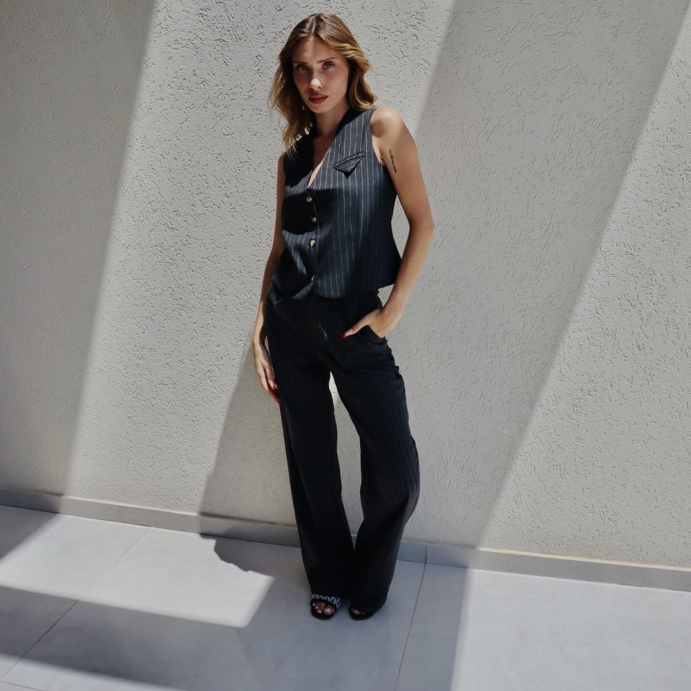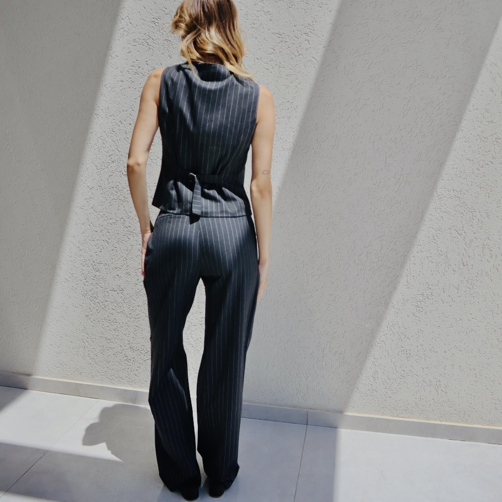 חליפת ווסט מחויטת ומדויקת. כיס משלוש בווסט העליון ובגב אבזם מתכתי. מכנסיים ארוכים ונשפכים בגזרה ישרה עם שני כיסים ציידים. החליפה נמכרת כשלמה = ווסט ומכנסיים