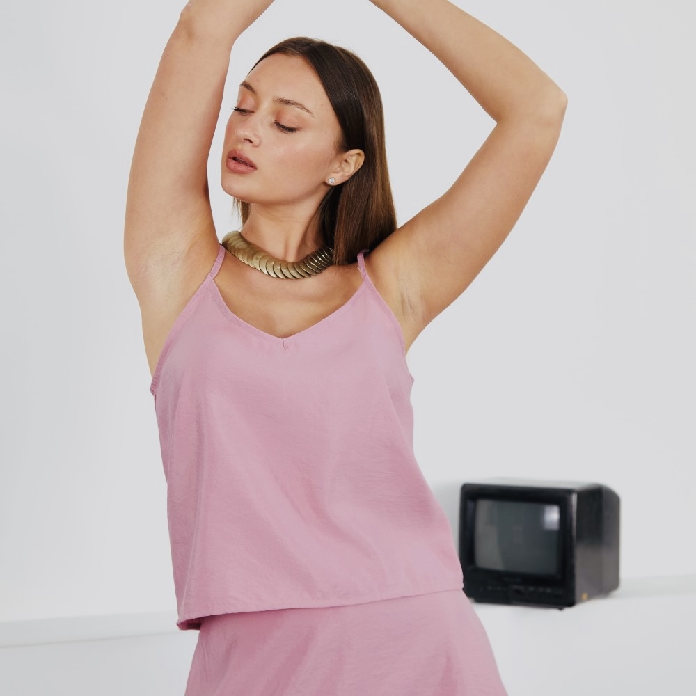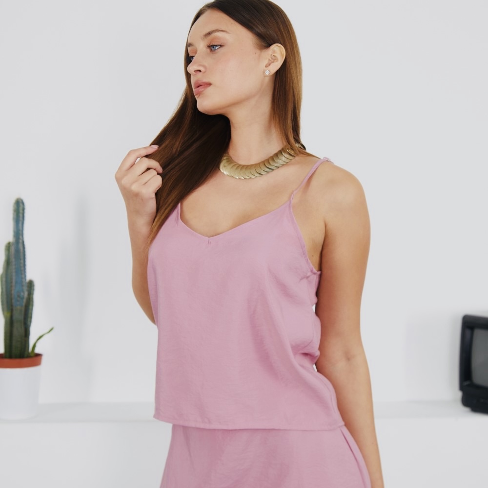טופ בגזרת גופיה עם כתפיות עדינות הניתנות להגדלה והקטנה. פתח וי קדמי ואחורי. מבד סטן מט למראה מיוחד ושיקי ביותר.