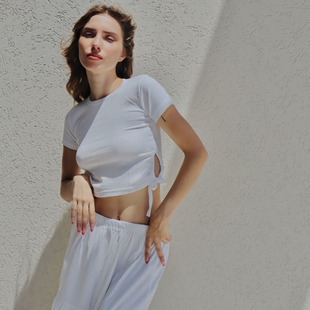 טופ קרופ בטן בעלת שרוולים קצרים.