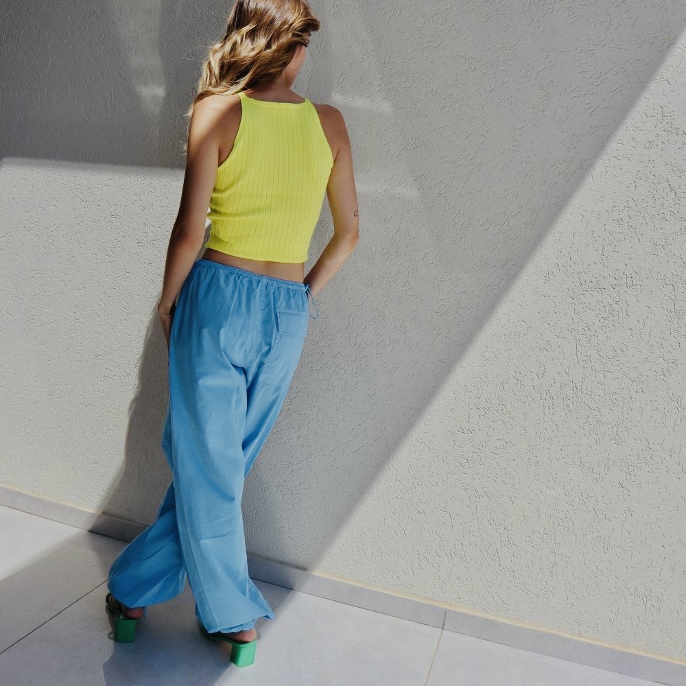 גומי אלסטי באזור המותניים ושרוכי כיווץ בסיומת המכנס.