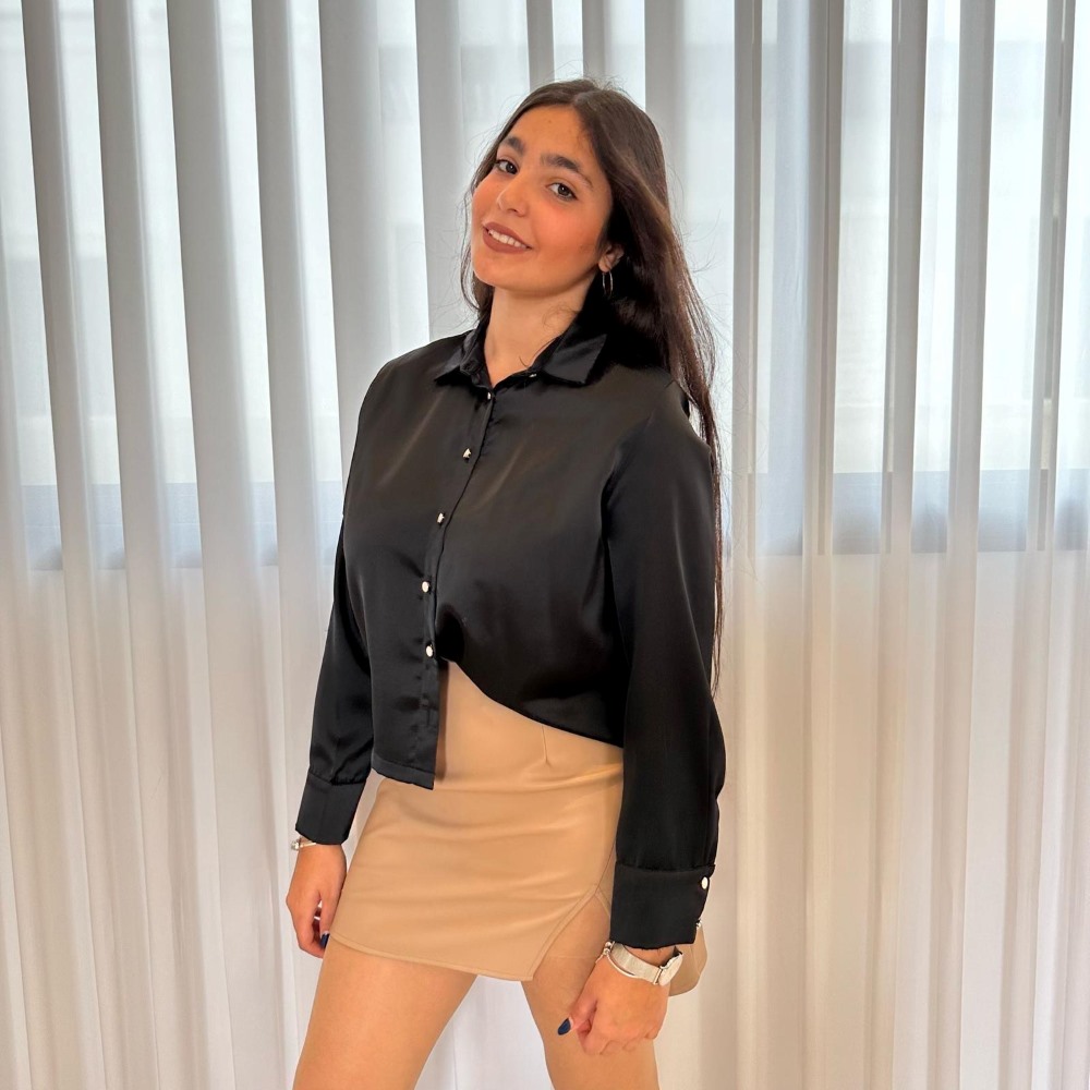 חצאית קצרה בגזרת מיני דמוי עור עם סיומת שסע קטנה בצד, בגזרה חלקה ונקייה. קווים צידיים דקים ועדינים. ללוק ה-ו-ר-ס ושלמותי.