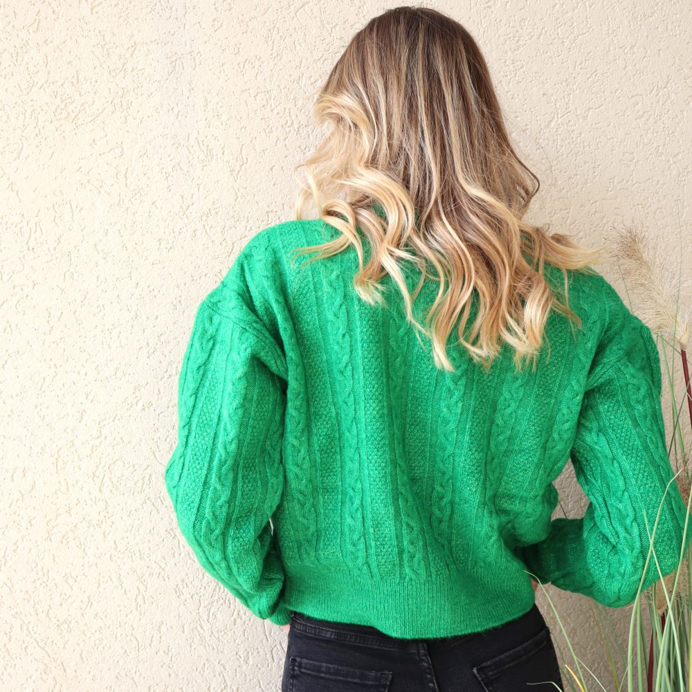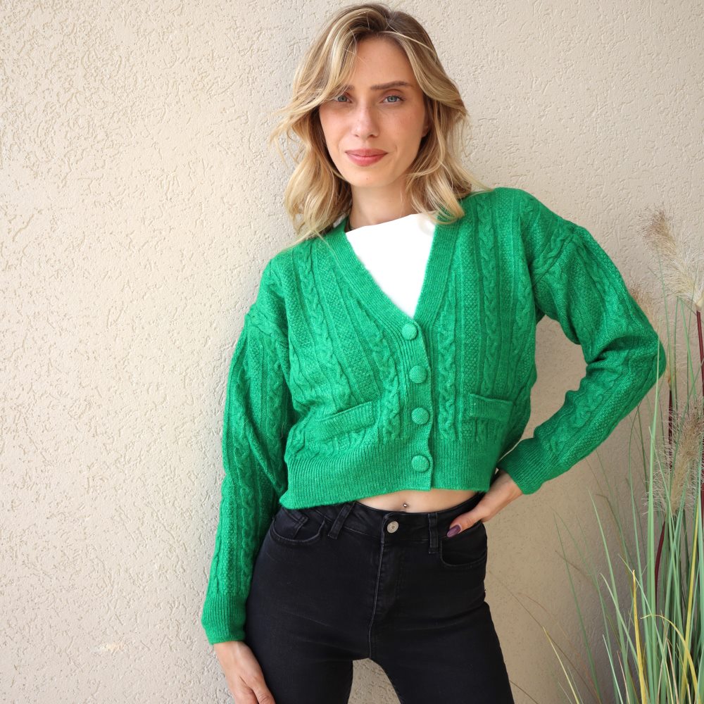 קרדיגן סריג בעל שרוולים ארוכים. קרדיגן באורך עד קו המותניים. בטקסטורת צמה. סריג לא עבה. ארבעה כפתורים. אופציה לסגור ופתוח. קרדיגן מושלם ומיוחד. מתאים למידות 34-38.