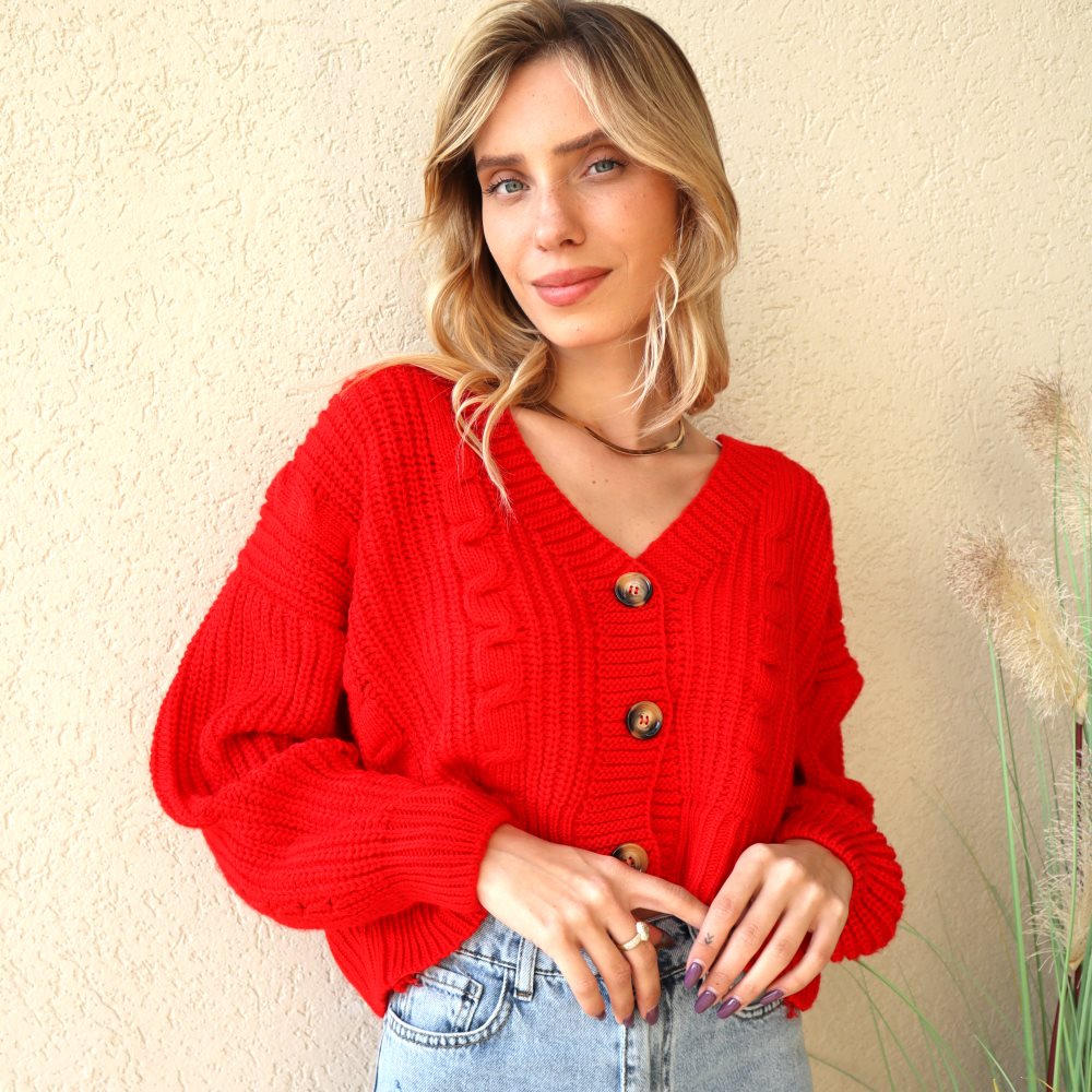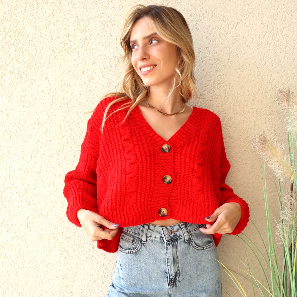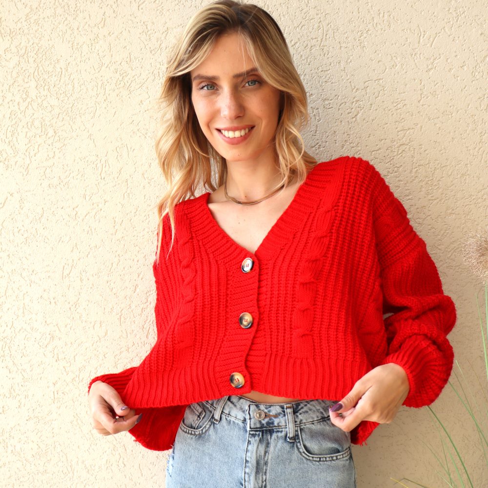 קרדיגן סריג קרופ. סריג בסריגת צמה. שרוולים ארוכים. קרדיגן בעל שלושה כפתורים גדולים. מתאים למידות 34-42. מתאים לשים טופ מתחת אך זה מהמם גם ללא. מגיע עד קו המותן. הסריג הנדיר שלנו.