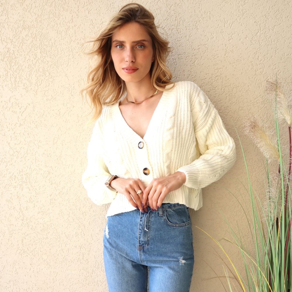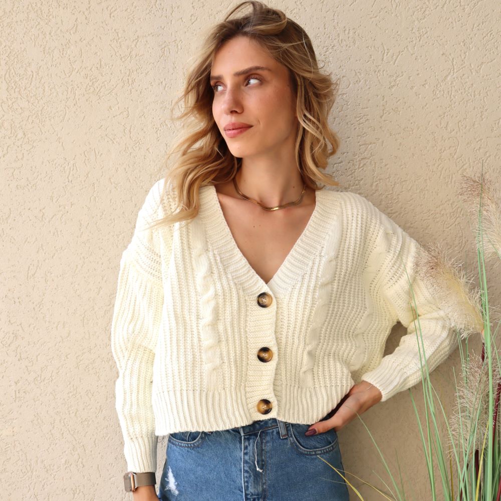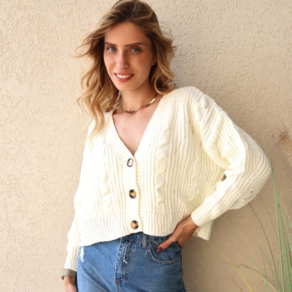 קרדיגן סריג קרופ. סריג בסריגת צמה. שרוולים ארוכים. קרדיגן בעל שלושה כפתורים גדולים. מתאים למידות 34-42. מתאים לשים טופ מתחת אך זה מהמם גם ללא. מגיע עד קו המותן. הסריג הנדיר שלנו.
