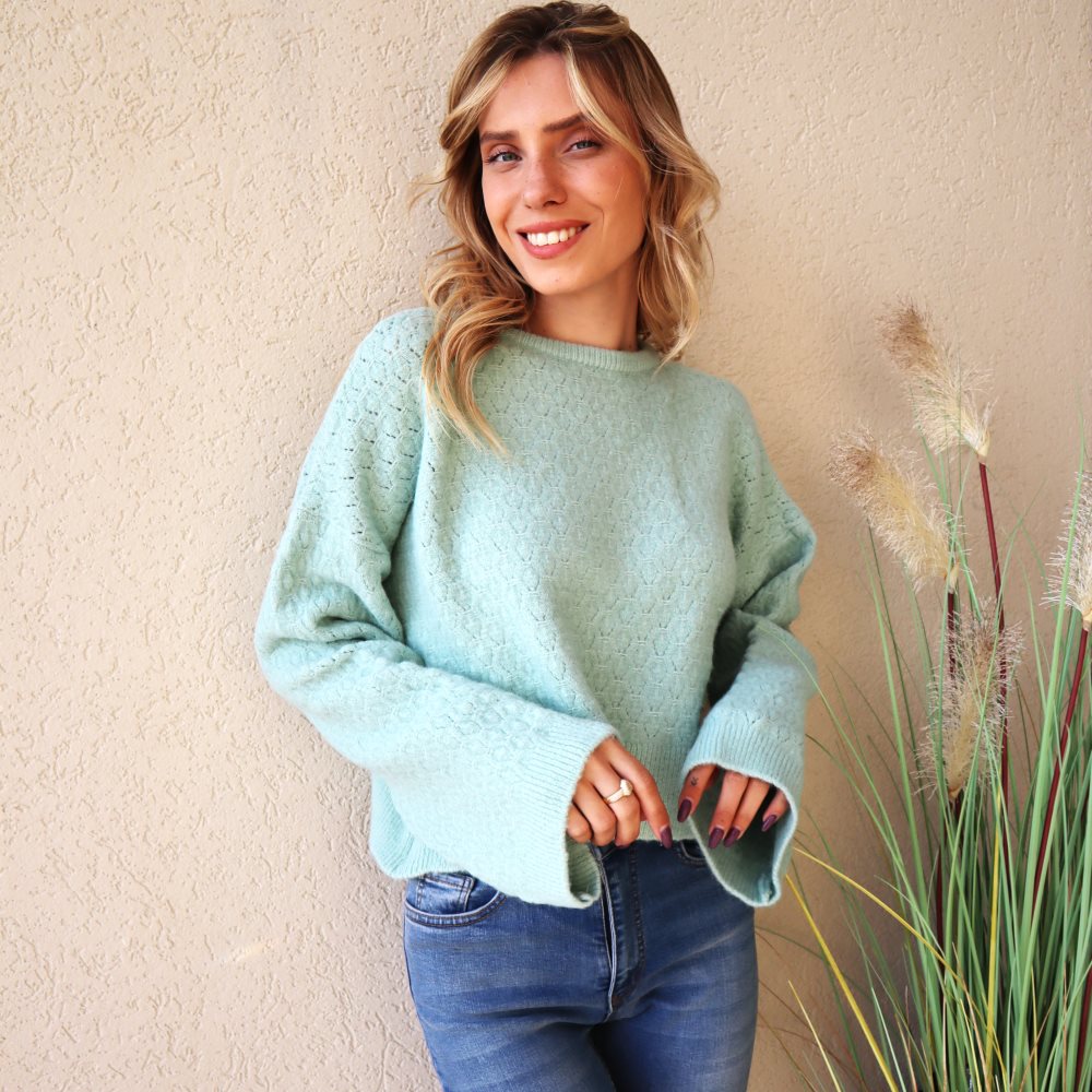 סריג הדגל שלנו לעונה. סריג בסריגה מיוחדת של מתומנים קטנים ועדינים. סריג בעל שרוולי פעמון רחבים וארוכים. בגזרה רחבה ומושלמת.